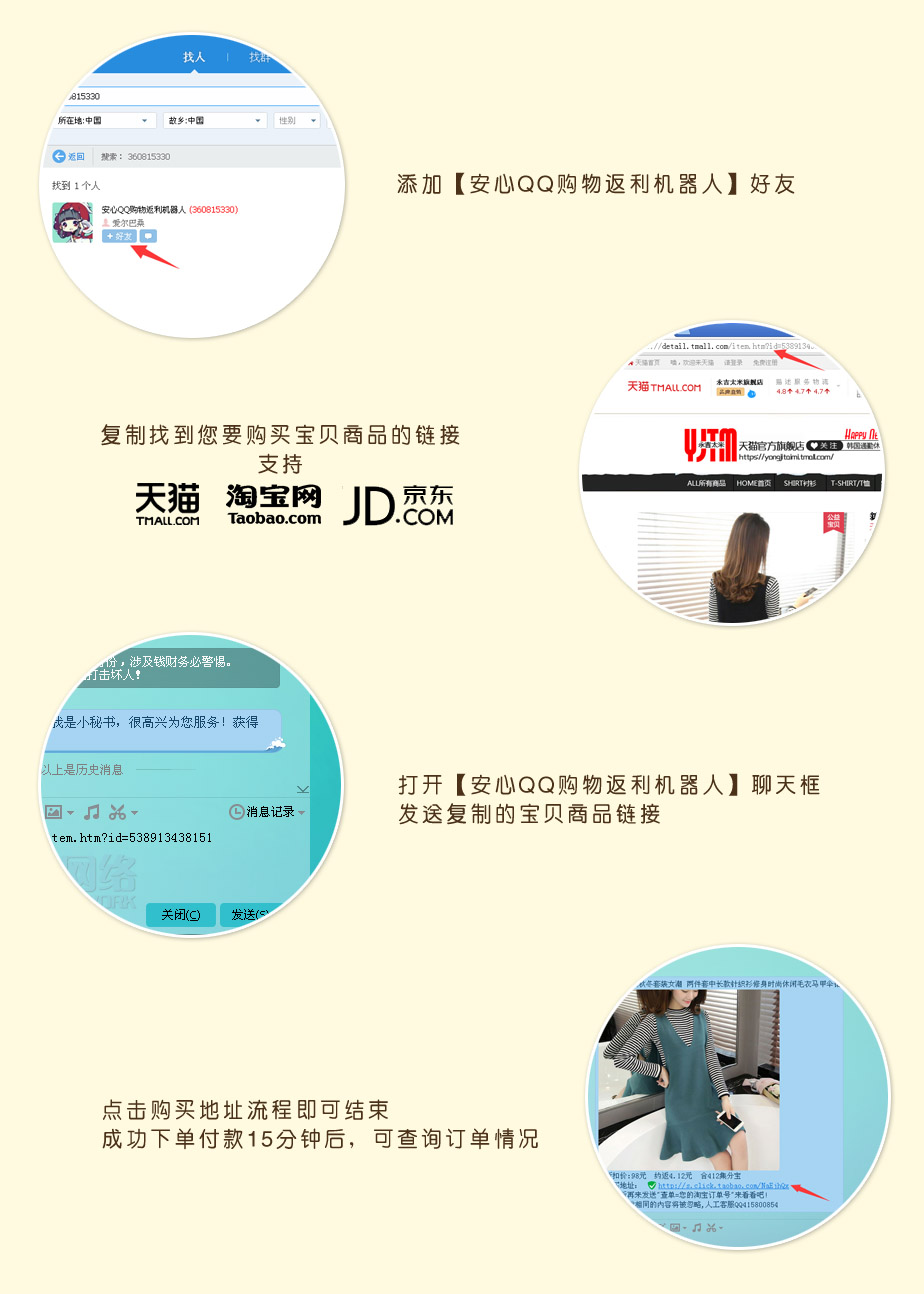 添加安心购物返利机器人官方QQ【409897】,发送购买产品链接给安心QQ购物返利机器人,点击【安心QQ购物返利机器人】生成的网址购物即可获取返利,复制链接购买无效。【安心QQ购物返利机器人】并会给您发送购买商品后返利具体金额。