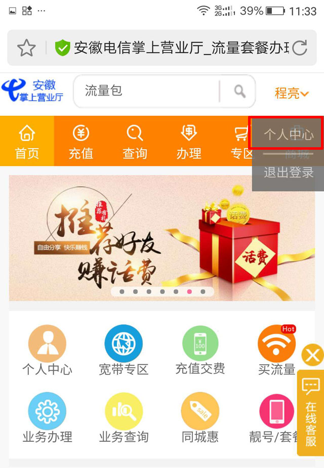 小编的地区属于安徽,先使用手机自带浏览器访问当前省的电信网址。安徽的是:ah.189.cn;打开网址后使用手机验证登陆。登陆后点击姓名,点击弹出的个人中心菜单。