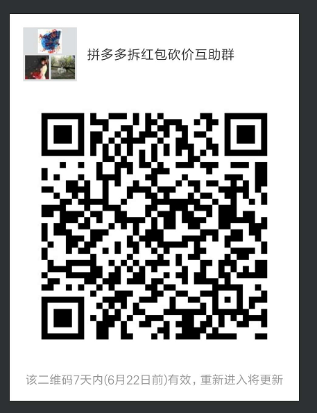 最新老是遇到朋友在微信上发拼多多拆红包和拼多多砍价的信息,感觉太麻烦了.所以就来建个微信互助群,可以加微信号:ailaopo2018,或者通过微信群二维码进来,群二维码2018年6月22号到期(后续不更新了,需要进群的直接加微信).
